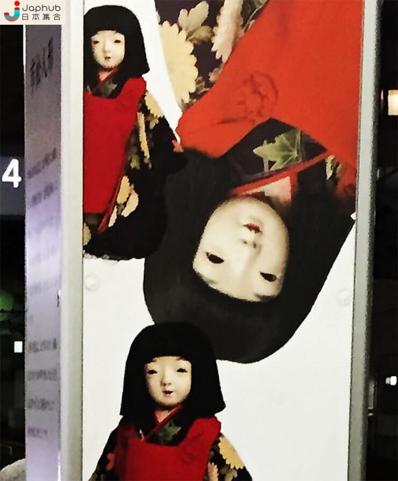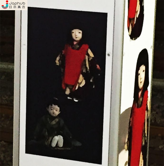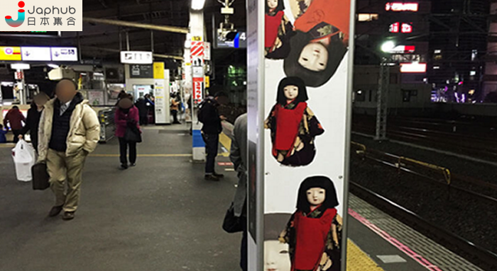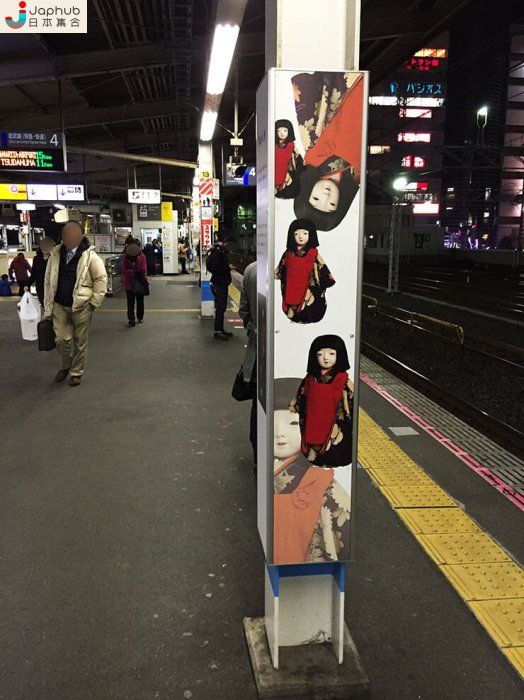 這根柱子就是網民覺得這個月台恐怖的地方了。這是市松人形,日本人偶的一種,是傳統的工藝品。如果在月台牆壁有市松人形的廣告,還沒甚麼問題。不知道是誰的主意,要在這麼狹窄的柱子賣這樣的廣告。再走近一點看吧︰