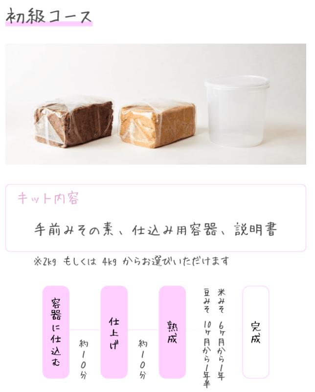 在這個計劃裡,分別有初級、中級和職人的味噌包,客人可以按能力挑戰。選擇初級的客人不需要自行把大豆煮熟攪捽搓揉和調味,只需直接把味噌放進容器內封存發酵,六個月至一年後味噌成熟,就大功告成。而選擇中級的客人,則需要從第一步開始做,並可以按個人喜好調味,相信中級班會帶來更大成功感。