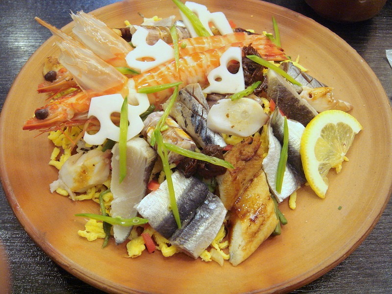 散壽司跟一般我們常吃的壽司不同,不是整整齊齊地握成一件件,而是將一大堆材料蓋上壽司飯上,刺身、熟魚、蔬菜等等都有,雖然賣相不太精緻,但卻十分豐富!