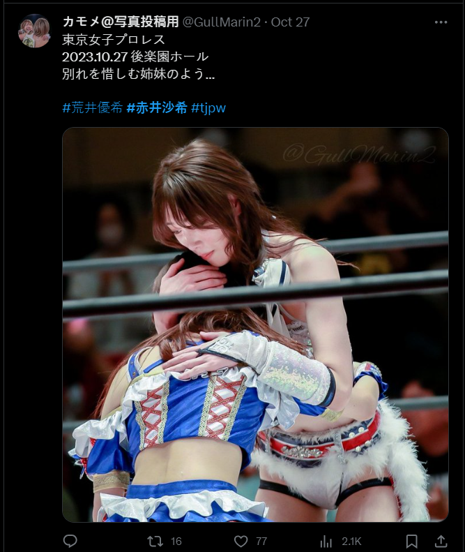 荒井優希聽到這句話,當場難過落淚,全場粉絲也感同身受哭成一團。現年36歲的赤井沙希效力於日本摔角聯盟DDT已經整整10年。不久前,她通過個人社交媒體宣布將於11月12日退休,她表示非常感謝身邊的人給予她愛與支持,希望能以自己的方式一直奮戰到最後,她也希望能保留在大家心目中的美好形象。