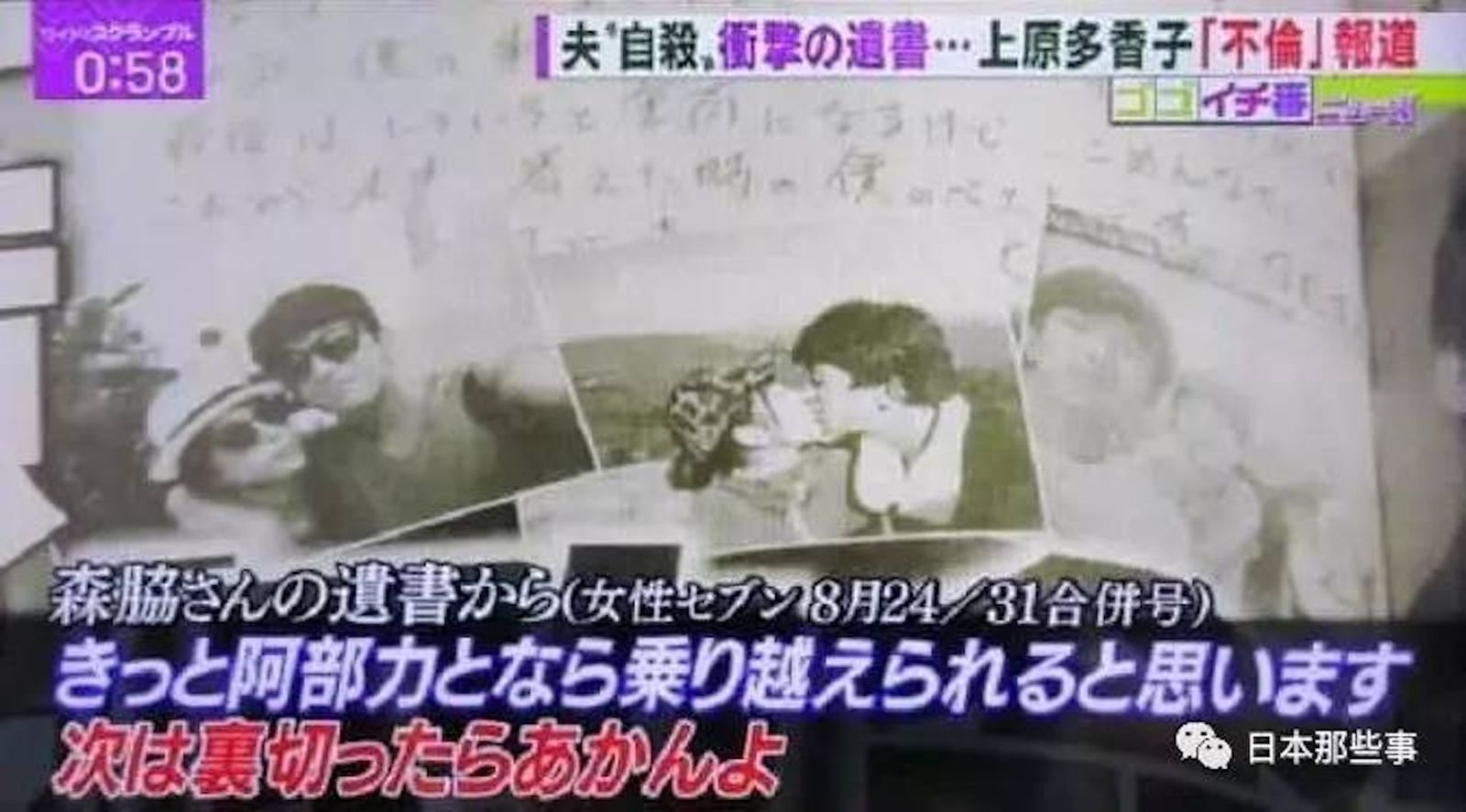 文春報導,TENN弟弟2017年爆料上原婚內出軌《花より男子》演員阿部力,握曖昧對話親吻照,上原停工消失。