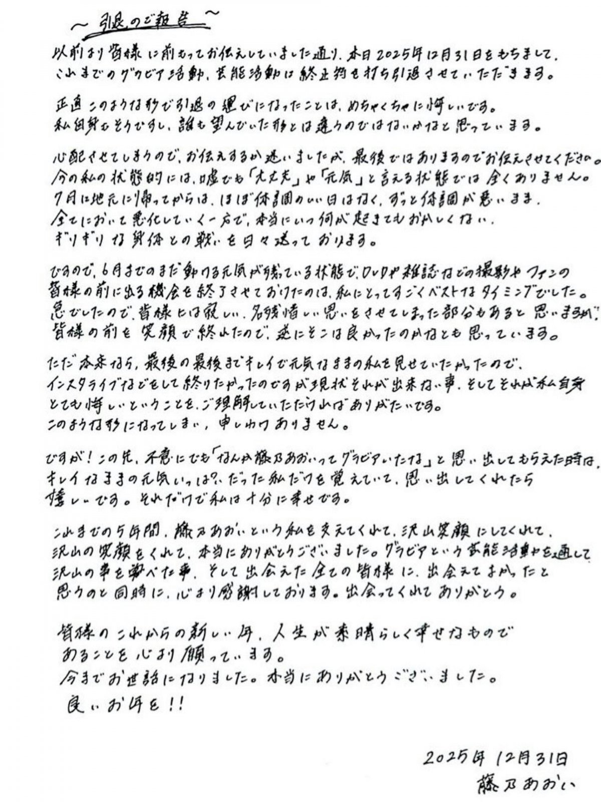 她在引退信中坦言,身體狀況隨時可能出問題,無法再強顏歡笑面對粉絲,只能用書信道別,寫下「最後了啊」、「真的非常喜歡你們」、「偶爾要想起我啊」,字裡行間滿是依戀。
