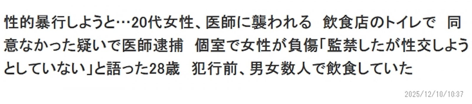 本來和朋友聚餐喝酒,結果酒意上頭,衝進女廁對認識的20多歲女子小林優子(化名)動手動腳。警方調查發現,他涉嫌非法拘禁和強制性交致傷,當場逮捕。