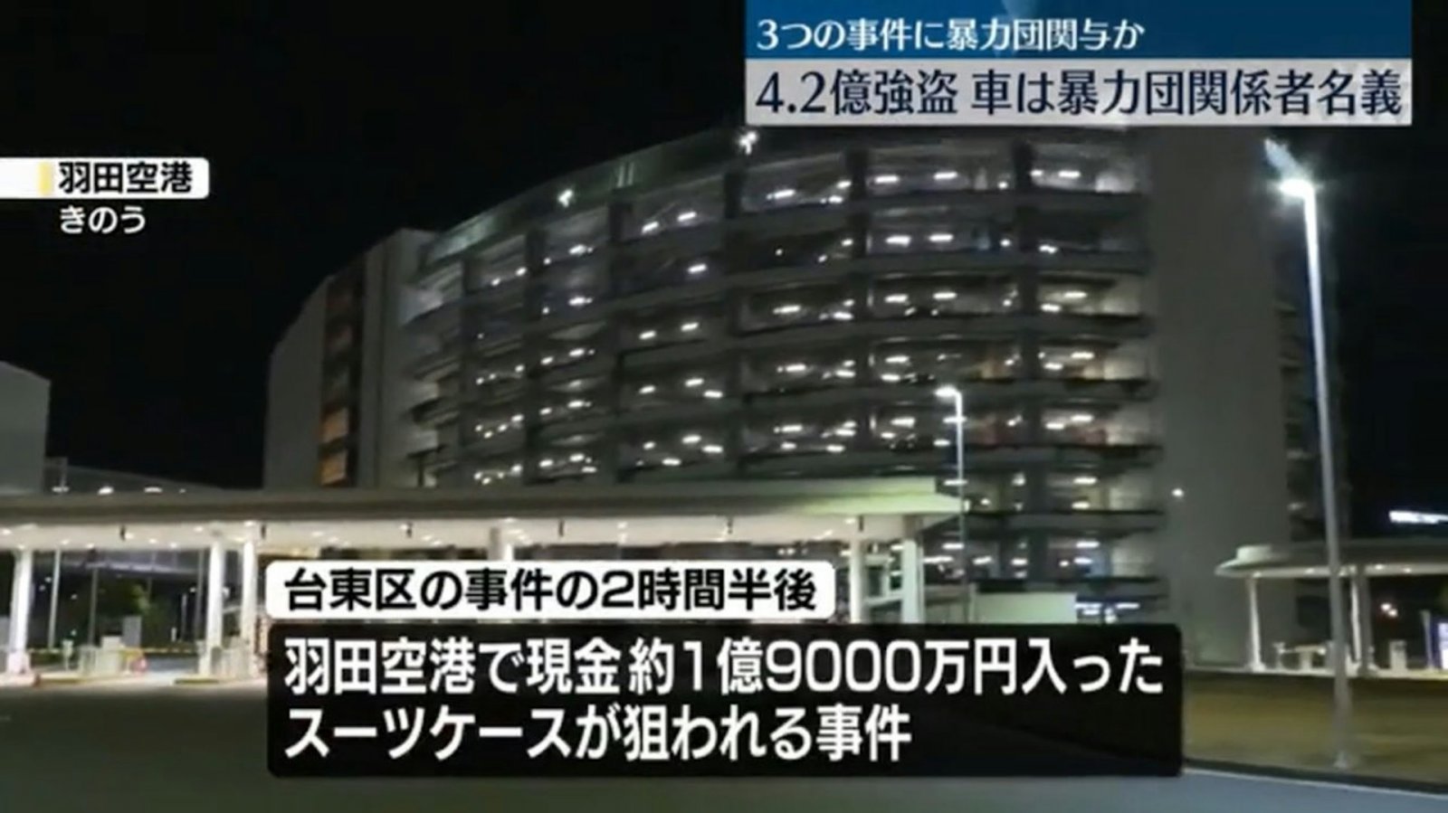僅3小時後,羽田機場停車場,一名50多歲男子攜1.9億日圓(約962萬港元)準備飛港,又遭4名歹徒噴催淚鎚砸車窗未遂,他力保不失抵港,