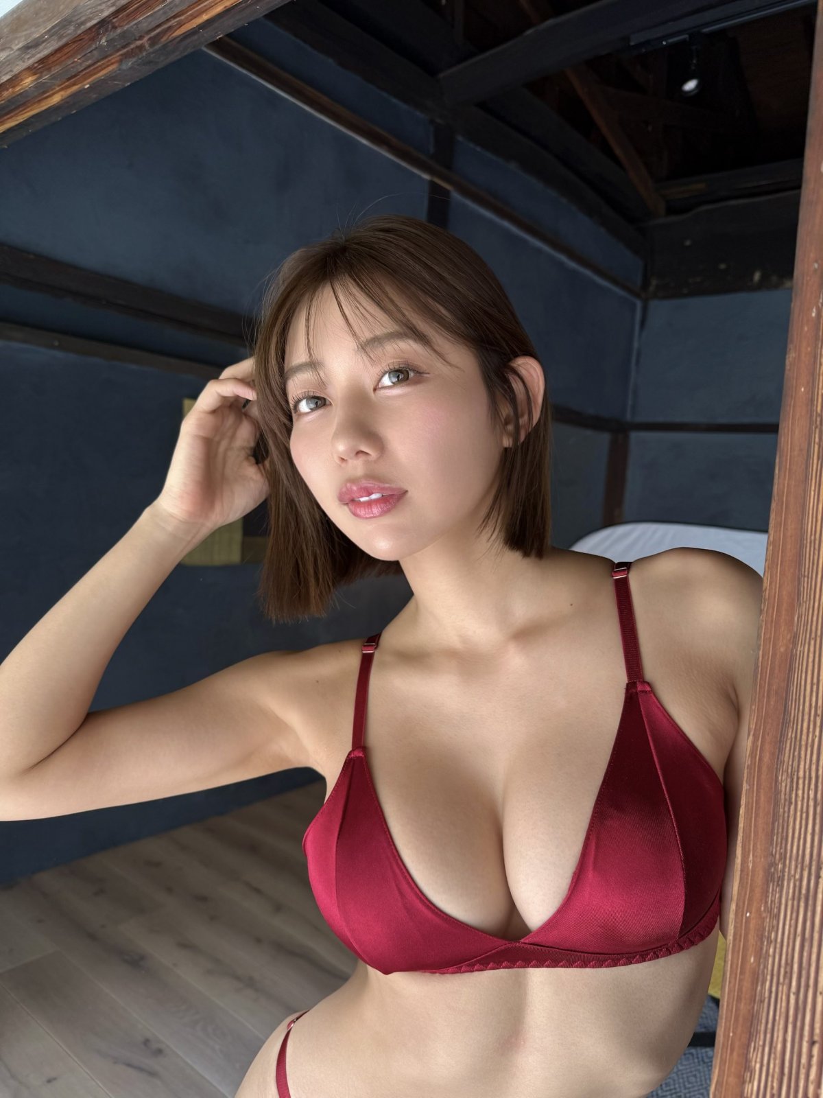 她的數字寫真集「PICTURA」,2026年推出,封面一曝光就讓人看呆!集子裡她從室內開始,穿深紅內衣坐在椅子上,微微傾身,露出G杯曲線,那肌膚質感像陶器般光滑,