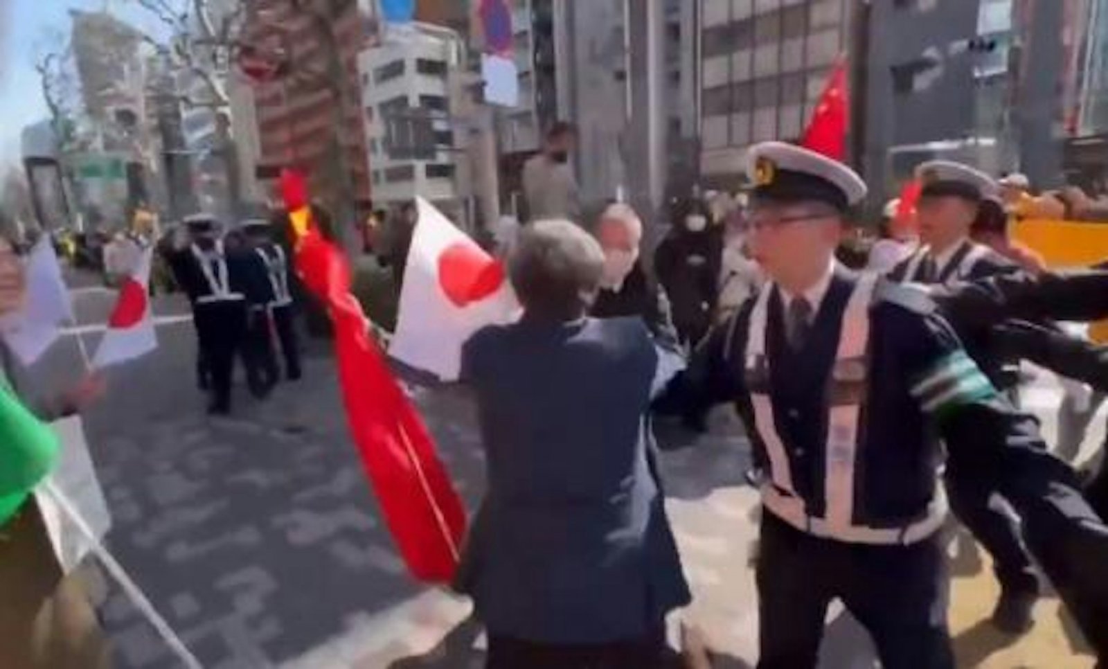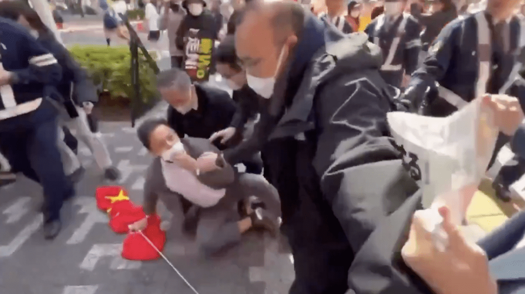 影片顯示,右翼分子衝向持旗男子,口喊口號後動手推倒,受害者倒地後起身離開,警方僅分隔未執法。據Sankei新聞,事件發生在新宿區,右翼團體常在公共活動抗議中國。