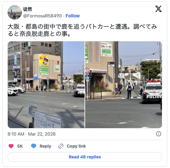 大阪市宮古島區善源寺町一帶3月22日上午8時30分左右接獲多起民眾報案,指有鹿隻出沒。該鹿隨後移動到距離繁華梅田商圈僅約2公里的公園內,引起民眾圍觀與警方警戒。