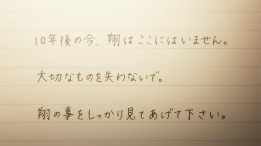 但「十年後的菜穗」在信的最後提到,在和翔的相處當中會為菜穗帶來一堆苦與樂,「希望自己不要重蹈覆轍,不讓10年前的自己留下這輩子最大的遺憾」。「因為十年後,翔已經不在了」……