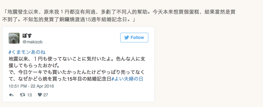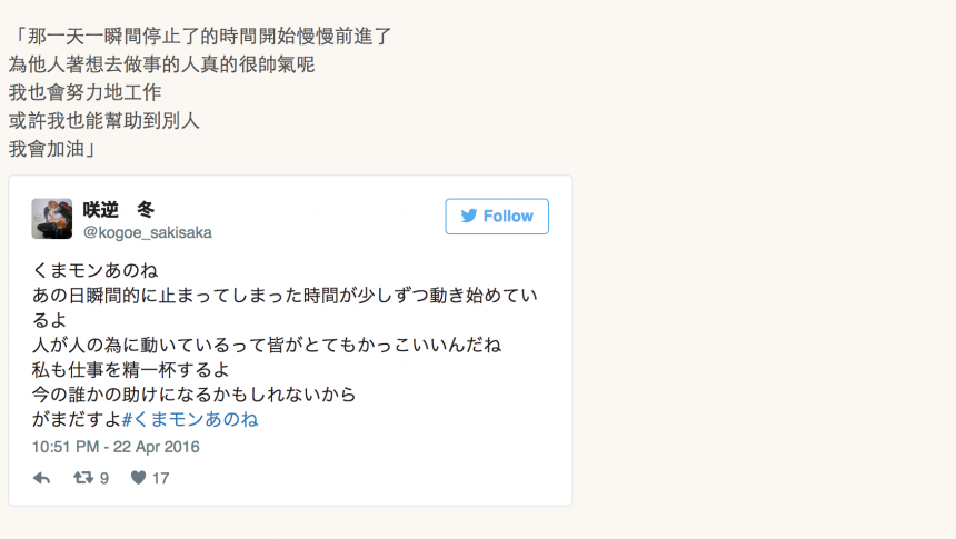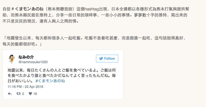 熊本縣地震的時候,我們已經介紹過,在網路上有幾多人想做幾多不同的事,想災民好過一點。當中,就包括一個簡單的 Twitter 行動,叫 #熊本熊聽我說 (#くまモンあのね):