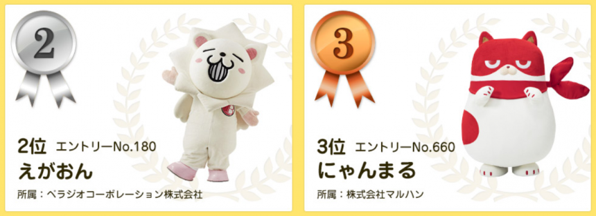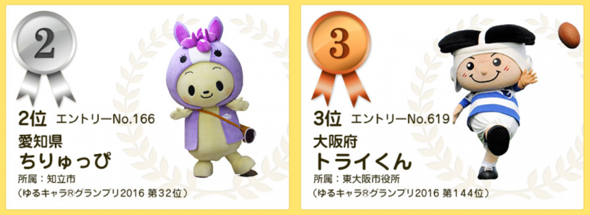 吉祥物比賽的投票日期為8月1日至11月10日,市民可在網上投票給心儀的候選吉祥物。第一位的うなりくん(千葉縣成田市)獲得80萬5328票,從去年的第22位大躍進。第二位是ちりゅっぴ(愛知縣知立市),第三位是トライくん(大阪府)。
