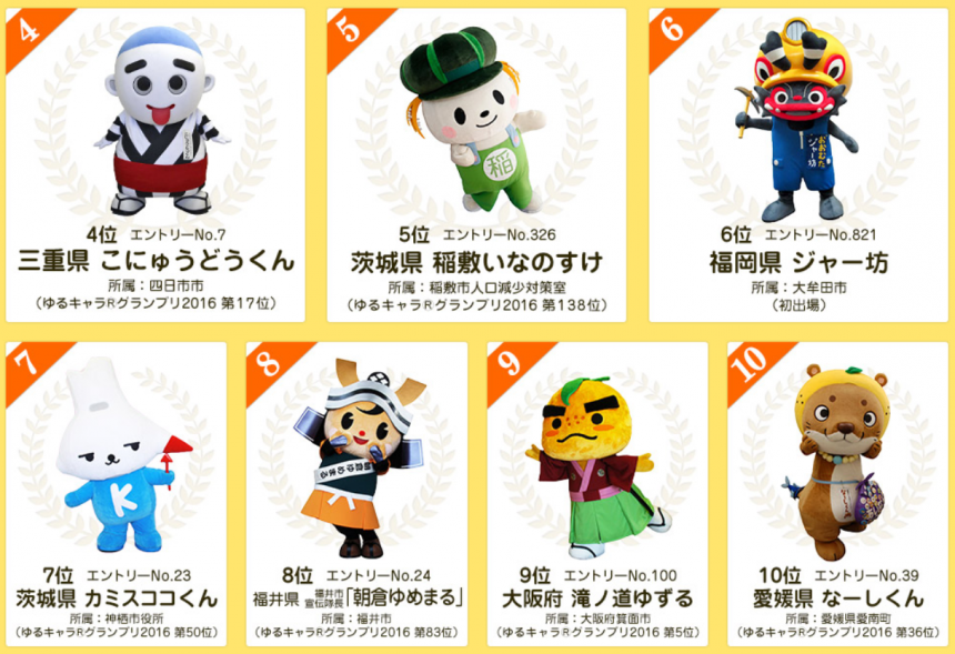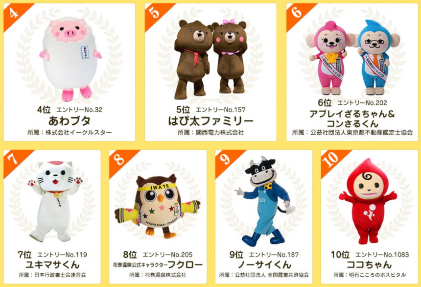 ▼ 第四至十位的吉祥物,第六位的ジャー坊初次出場已經獲得優異成績。
