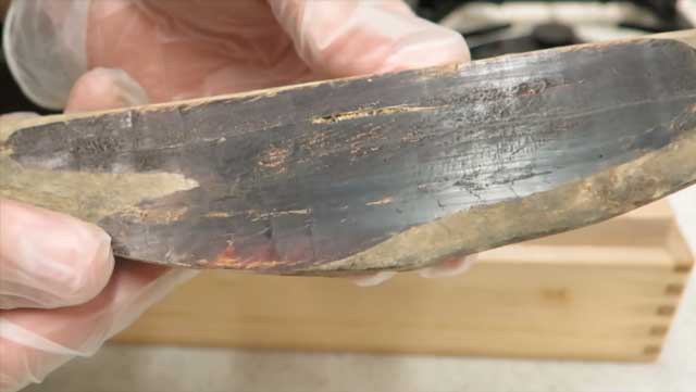 當鰹魚乾刀開始成形的時候,放進焗爐裡烤乾,最後用研石調整刀的形狀。這個花了數小時製作的刀,真的很漂亮!大概這是世上最美味的刀吧(笑)