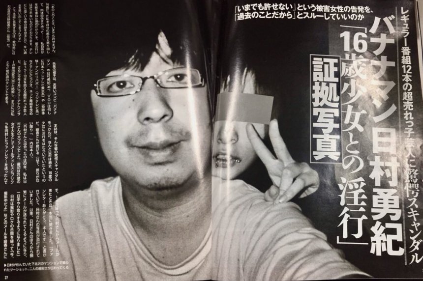 今日八卦雜誌《FRIDAY》揭發,諧星組合「香蕉人」的日村勇紀曾與未成年少女發生性行為。本來日村說對於事件沒有印象,但後來其事務所又承認當年二人有交往,並向公眾謝罪。
