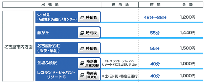 名鐵集團亦另外開設連結中部機場至榮、 伏見等名古屋巿中心區域的巴士,無須事先預約, 車資為1200円, 可以節省電車換乘時間及不用拖著沉重的行李乘搭地鐵。